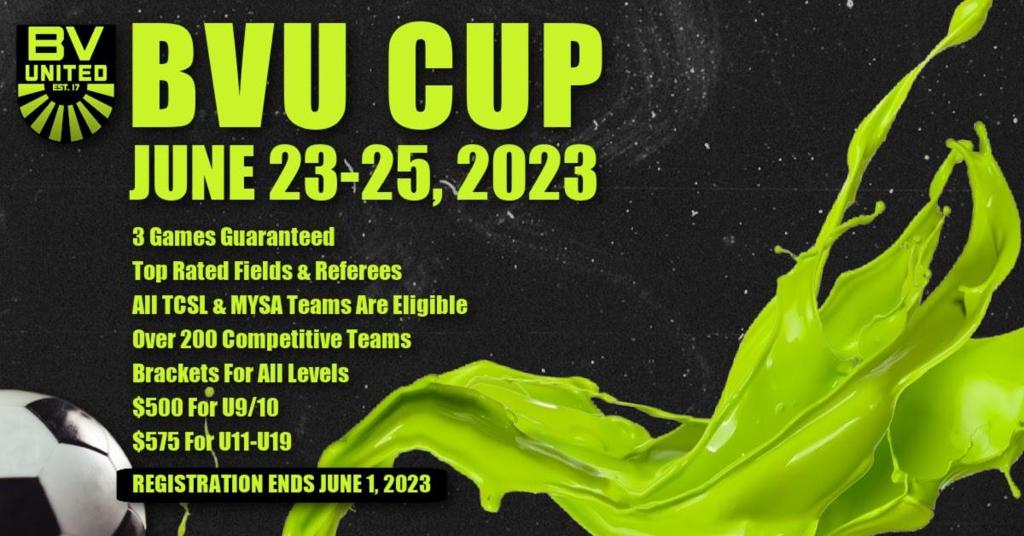 Mark your calendars for the 2023 BVU Cup June 23-25! Join over 200 competitive teams and play a guaranteed 3 games.